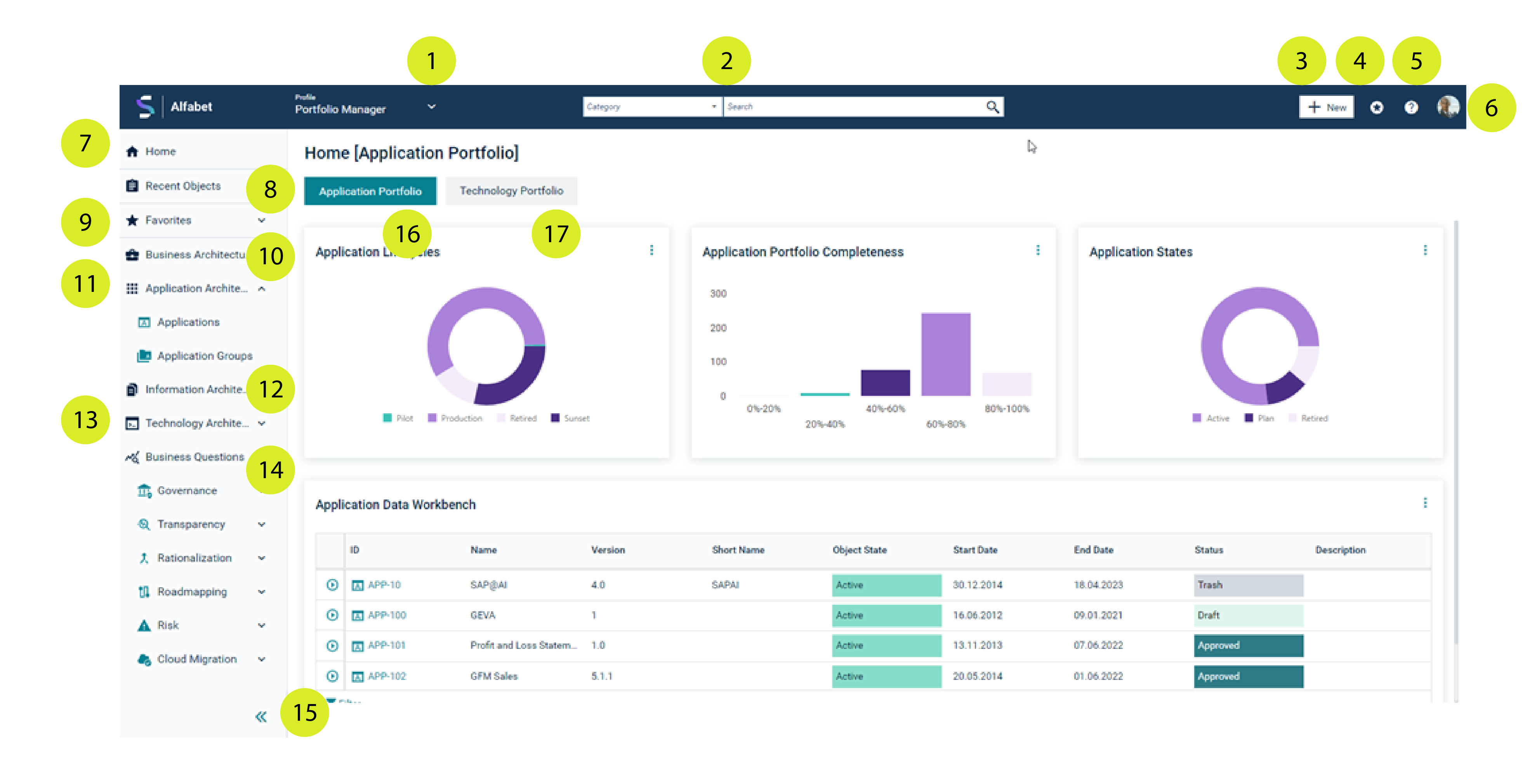 Alfabet FastLane provides a clean, modern, and intuitive user interface that is easy to navigate. Use the navigation panel on the left to find your entry point to start working with your data in the content area on the right. Use the back arrow and forward arrow in your browser to go to views in your navigation history.
