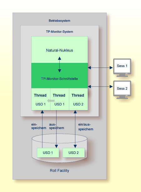 Das folgende Diagramm veranschaulicht, wie ein TP-Monitor (hier: Com-plete) die Speicherzuordnung verwaltet, indem er Natural-Threads in eine Roll Facility ein- und ausspeichert: