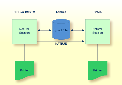 Batch-Jobs, die Reports in der Spool-Datei erstellen, können offline oder online mit Hilfe der Natural Remote Job Entry-Funktion NATRJE (Jobfernverarbeitung), die in der Natural-Debugger und Dienstprogramme-Dokumentation beschrieben wird, übermittelt werden. Auf diese Weise ist es möglich, Online-Natural-Anwendungen zu erstellen, die zeitaufwändige Operationen an Batch-Jobs übertragen, die wiederum die Ausgabe an die Online-Natural-Umgebung zurückspoolen.