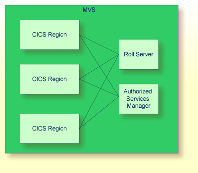 Einzelnes z/OS mit mehreren CICS-Regionen, einzelnem Roll-Server und (optional) Authorized Services Manager