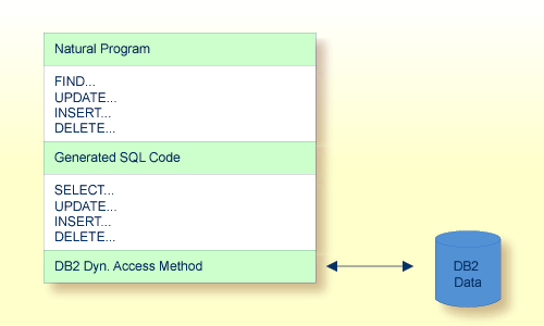 Der Zugriff auf Db2 über Natural erfolgt unabhängig davon, ob die dynamische oder die statische SQL-Unterstützung verwendet wird, in derselben Form. Bei statischer SQL-Unterstützung können dieselben SQL-Statements in einem Natural-Programm sowohl im dynamischen als auch im statischen Modus ausgeführt werden. Ein SQL-Statement kann innerhalb eines Natural-Programms kodiert und zu Testzwecken mit dynamischem SQL ausgeführt werden. Ist der Test erfolgreich, bleibt das SQL-Statement unverändert und es kann statisches SQL für dieses Programm generiert werden.