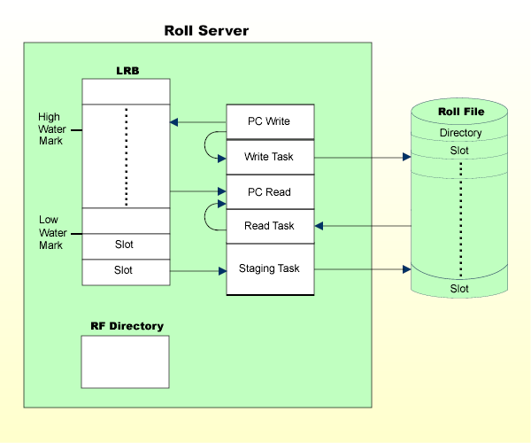 Der Roll Server kann mit bis zu fünf verschiedenen Roll Files betrieben werden. Jedes dieser Roll Files ist logisch mit einem lokalen Roll Buffer verbunden. Wenn es fünf Roll Files gibt, gibt es auch fünf entsprechende LRBs. Der Zugriff auf jedes Roll File erfolgt über eigene Lese-, Schreib- und Einstufungs-Tasks (Read, Write, Staging Tasks). Wenn die Roll Files auf verschiedenen Platten in unterschiedlichen Kanälen angelegt werden, kann also gleichzeitig auf die Roll Files zugegriffen werden.