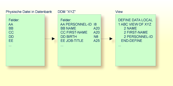 Damit Natural auf eine Datenbank-Datei zugreifen kann, ist eine logische Definition der physischen Datenbank-Datei erforderlich. Eine solche logische Dateidefinition wird DDM (Datendefinitionsmodul) genannt.
