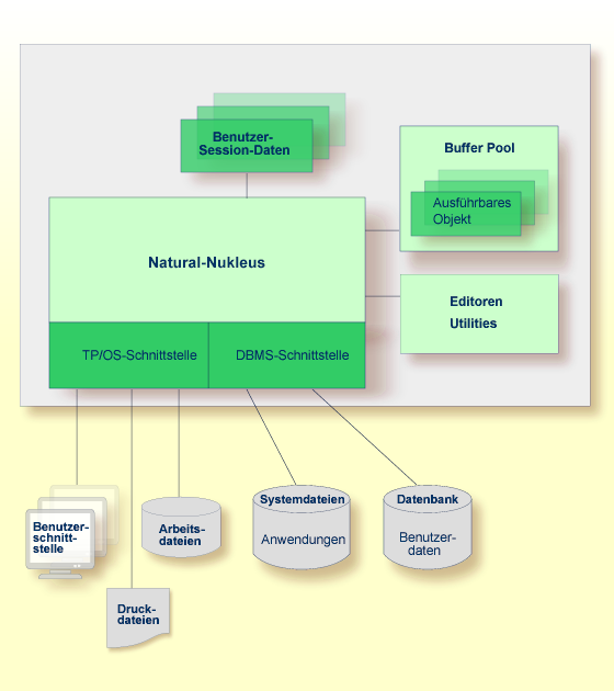 Die Natural-Komponenten sind über spezielle systemabhängige Tabellen und Routinen in die Systemumgebung eingebettet und stellen die internen Funktionen mit den erforderlichen Ressourcen zur Verfügung.