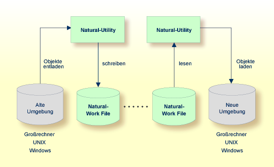 Das folgende Diagramm veranschaulicht, wie die in einer Arbeitsdatei (Work File) enthaltenen Daten verwendet werden können, um Natural-Objekte zwischen verschiedenen Natural-Umgebungen auf unterschiedlichen Plattformen zu übertragen. Dies geschieht mit Hilfe eines Dienstprogramms, einer Natural-Utility (z.B. der Object Handler), mit dem die in der Ursprungsumgebung vorhandenen Objekte in ein Work File entladen und von dort in die Zielumgebung geladen werden. Falls erforderlich, wird ein Anwendungsprotokoll, z.B. FTP, benutzt, um Work Files von Ursprungs- in Zielumgebungen zu übertragen.