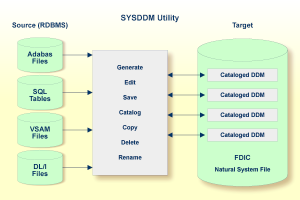 Die SYSDDM Utility wird verwendet, um ein Natural-Datendefinitionsmodul (Data Definition Modules/DDM) aus einer Datenbankdatei oder aus einem anderen DDM zu erstellen. Ein Natural-Objekt (z.B. ein Programm oder ein Datenbereich (Data Area) kann auf eine Datenbankdatei nur dann zugreifen, wenn für diese Datei ein entsprechendes DDM erstellt und als katalogisiertes Objekt gespeichert worden ist. Weitere Informationen zu DDMs siehe Datendefinitionsmodul (DDM) im Leitfaden zur Programmierung.