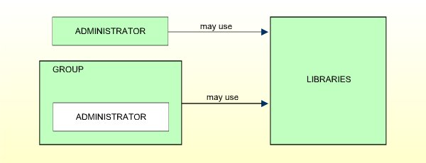 Administratoren dürfen Bibliotheken direkt benutzen. Sie können auch Gruppen zugewiesen werden. Sie können also Bibliotheken entweder direkt oder über die Mitgliedschaft in Gruppen nutzen. In dieser Hinsicht entsprechen sie dem Benutzertyp PERSON.