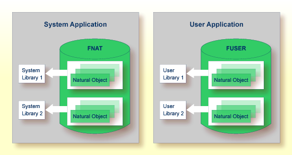 Natural objects contained in the Natural system files FNAT and FUSER are grouped into logical constructs called libraries as illustrated in the diagram below: