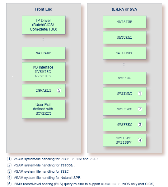 Natural for VSAM is fully (E)LPA or SVA-compliant for multiple environments (for example, CICS, Com-plete and batch). The Natural parameter module and the appropriate I/O module must be linked to the front-end module.