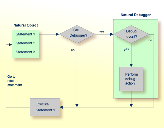 The following graphic illustrates an example of the process flow when a Natural object is executed with the debugger: