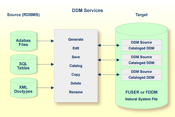 DDM Services are used to create a Natural DDM from a database file or from another DDM. A Natural object (for example, a program or a data area) can only access a database file if a corresponding DDM has been created for this file and saved as a source object and a cataloged object. For further details on Natural DDMs, see Data Definition Modules - DDMs in the Programming Guide.