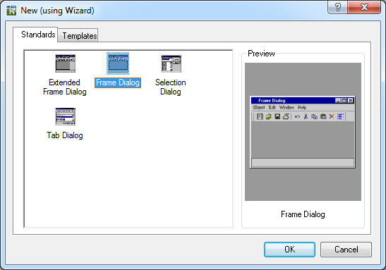In the Frame Dialog Wizard a new dialog can be created in a Frame Layout. The structure of the Frame Dialog for example is applicable in an application frame.