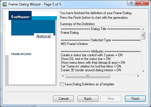 On the last page of the dialog wizard a check box can be checked to force the saving of the dialog in a template file after you have completed the definition of the dialog. A standard windows save dialog is opened where a file name can be defined. Independently of the created template, the dialog is generated and displayed in the dialog editor.