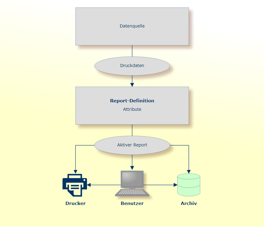 Das Drucken eines aktiven Reports kann entweder automatisch, in Abhängigkeit von Attributangaben in der Report-Definition oder manuell von einem Benutzer ausgelöst werden.