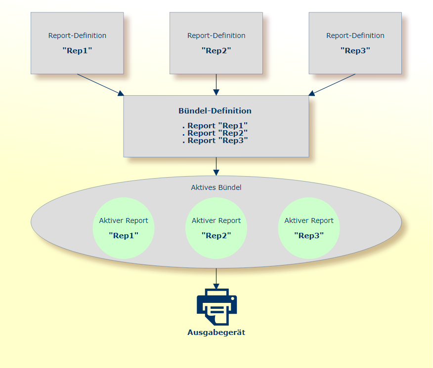 Reports können zu größeren Datenpaketen, sogenannten "Bündeln", zusammengefasst und als Einheit verarbeitet werden. Eine solche Bündelung ist auch dann möglich, wenn die Reports auf unterschiedliche Datenquellen zeigen.