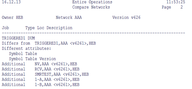 Ergebnisse des Vergleichs eines oder mehrerer Netzwerke. Der Bericht zeigt, ob alle Jobs eines Netzwerks in einem anderen Netzwerk vorhanden sind. Außerdem werden die Definitionen der Netzwerke und die aller gleichnamigen Jobs verglichen. Weitere Informationen siehe Vergleiche Netzwerke in Batch. Siehe auch Beispiel für Vergleiche Netzwerke. |