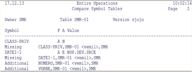 Dieser Batch-Bericht zeigt die Ergebnisse des Vergleichs einer oder mehrerer Symbol-Tabellen. Siehe auch Beispiel für Vergleiche Symboltabellen.