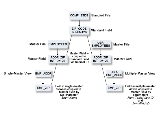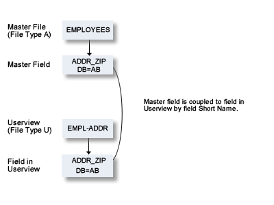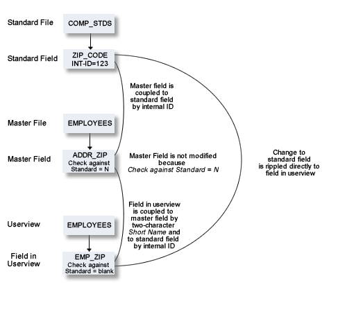 Changes to master fields are rippled to fields in userviews that were derived from master files. If the master field is coupled to a standard field, changes to the standard field are rippled to the coupled master field and to the derived field in the userview.