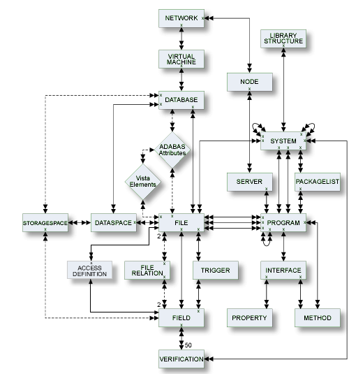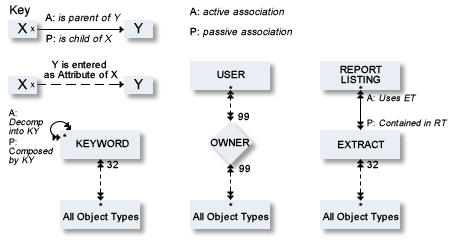 The metastructure of the Predict data dictionary is illustrated below. Additional object types and association types can be defined with Metadata Administration functions. These objects are referred to as User Defined Object/Association Types or User Defined Entities (UDEs). See the section Metadata Administration in the Predict Administration documentation.