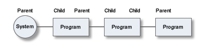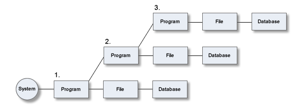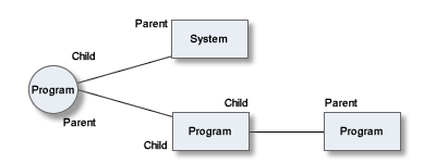If, for example, the substructure program-file-database in the first of the two examples in What is a Retrieval Structure? was executed with depth three, the retrieval structure shown in the diagram below results. The repetitions start with a recursive association of type Program-Program.