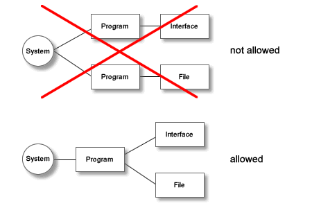 A line in this screen represents an association between two object types. A relation between the various lines (associations) is established via the level number: