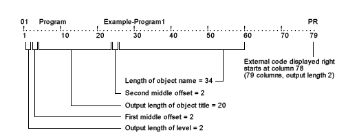 | Right | Information is positioned according to its length starting at the right margin. If, for example, the object name is displayed on the right hand side and its output length (parameter Length of object name) is set to 20, the name is displayed starting in column 60 (79 columns minus the length of the information). This position is calculated only once. Either the first line information or the second line information is used for the calculation, whichever is the longer. |