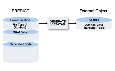 The function implements Vista elements of Predict file objects of type A (Adabas) in the translation tables of Adabas Vista. The Generate Vista table function has to be executed for each Adabas file that is to be implemented.