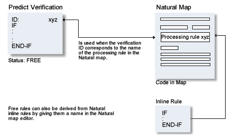 A free rule is used in a Natural map by specifying the ID of a verification of status free. The Natural code of the processing rule stored with the verification will be included into the map when the map is cataloged. Free rules can be defined and modified with the Natural map editor and directly in Predict.