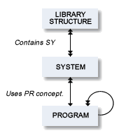 An object of type library structure documents a structure which describes a runtime or development environment (for example libraries for copy code). The system objects which document these libraries are linked as children to the library structure via "Contains SY". The following rules apply: